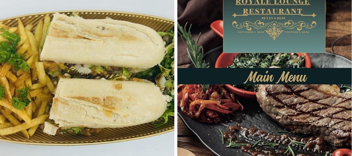 Royale Lounge Restaurant specializes in European and English cuisine, featuring a diverse menu with options ranging from soups to burgers to pizza.